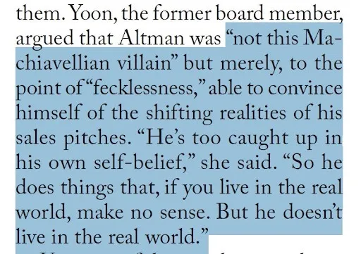 Авторы работы пишут, что осенью 2023 года главный научный сотрудник OpenAI Илья Суцкевер собрал около 70 страниц служебных записок об Альтмане и его заместителе Греге Брокмане. Одна из них начинается со слов: «Сэм демонстрирует постоянную склонность ко лжи».
